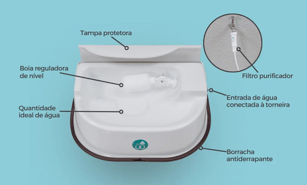 O bebedouro inteligente garante água limpa, fresca e abundante para seu peludinho dia e noite, de forma totalmente automática. Conectado a uma torneira, ele conta com uma boia de nível e um filtro de carvão ativado, que mantêm a água filtrada e pronta para o consumo.