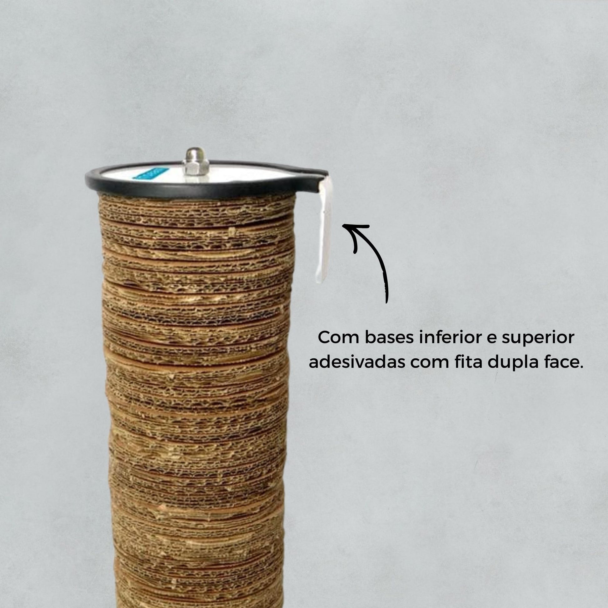 Com bases inferior e superior adesivadas com fita dupla face. Pode ser fixado na parede ou móveis estáveis com tamanho compatível, sem a necessidade de furos. Estrutura com discos de papelão reciclado, que podem ser trocados quando desgastados.