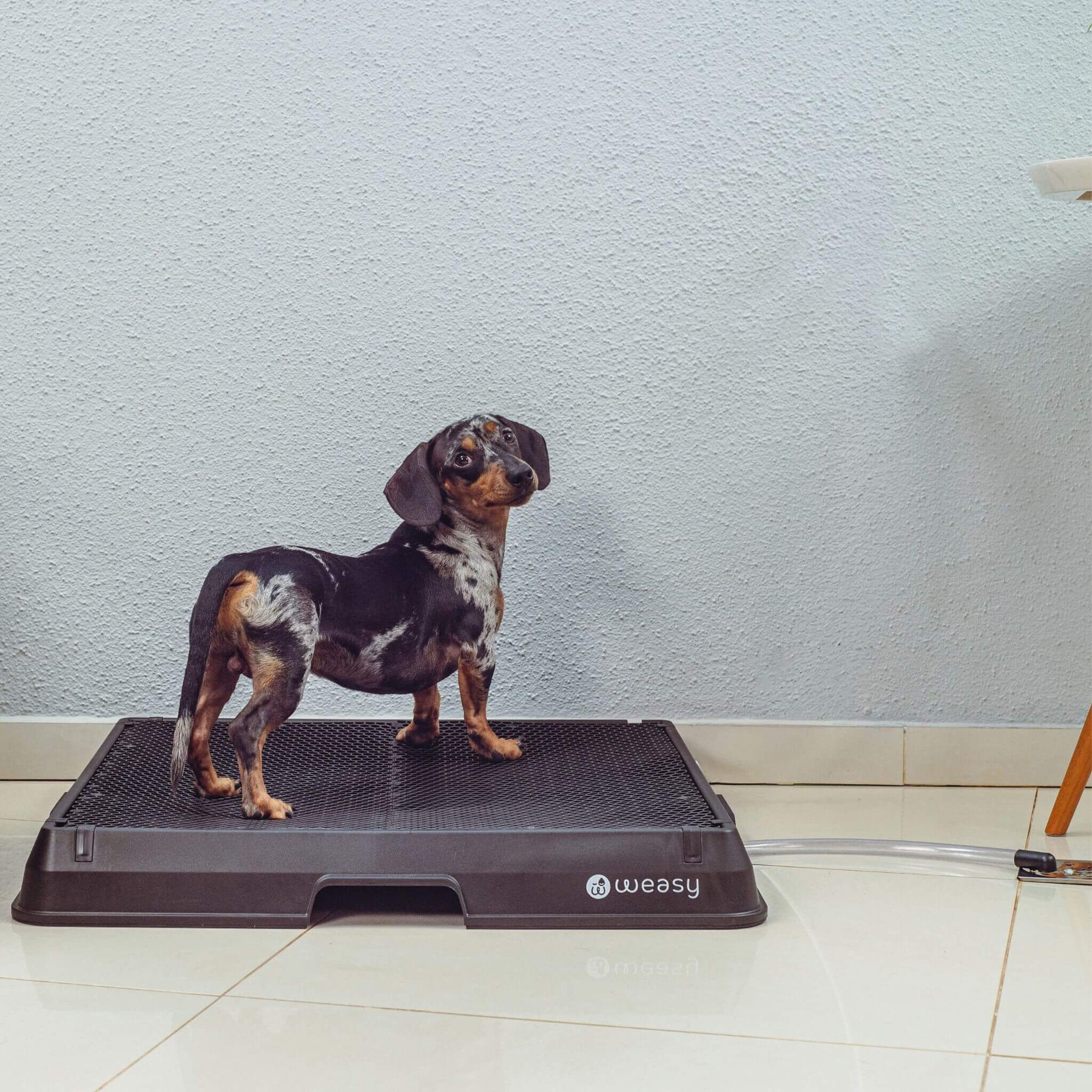 Mas em caso de cães mordedores, recomendamos instalar o Weasy sobre o ralo e deixar a mangueira sob a bandeja, escondida e protegida de possíveis mordidas. Corte ela o quanto precisar para garantir que fique o mais reta possível. Caso ocorra um acidente com as partes mais moles temos peças de reposição em nosso site.